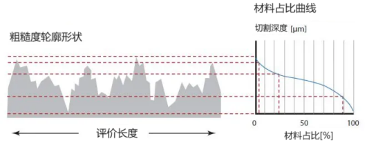 其實不是,兩者還是有較大的差異的。為了評估這種差異,這里我們引入一個比較常用的評價參數(shù),那就是材料占比Rmr,通常以一個曲線(也稱Abbott-Firestone曲線)來表示,如下圖所示。它描述了在評價長度范圍內(nèi),從山峰到谷底,在任何一個切割面上,有效材料面積占總面積的一個比值。